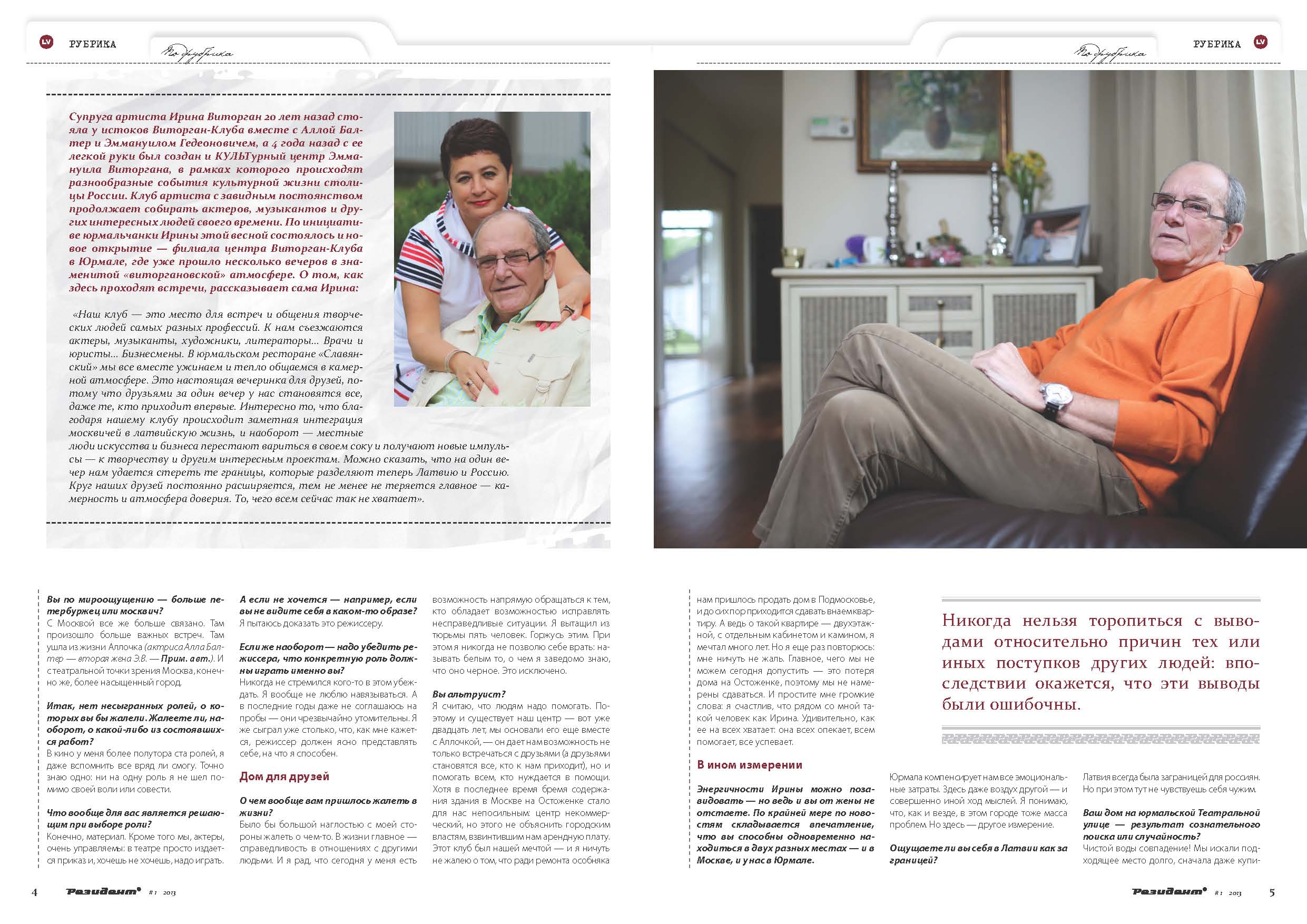 Супруга артиста Ирина Виторган 20 лет назад стояла у истоков Виторган-Клуба вместе с Аллой Балтер и Эммануилом Гедионовичем, а 4 года назад с ее легкой руки был создан и КУЛЬТурный центр Эммануила Виторгана, в рамках которого происходят разнообразные события культурной жизни столицы России. Клуб артиста с завидным постоянством продолжает собирать актеров, музыкантов и других интересных людей своего времени. По инициативе юрмальчанки Ирины этой весной состоялось и но-вое открытие — филиала центра Виторган-Клуба в Юрмале, где уже прошло несколько вечеров в знаменитой «виторгановской» атмосфере. О том, как здесь проходят встречи, рассказывает сама Ирина: