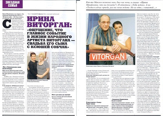 После того как мы приехали на так называемую премьеру фильма, информация каким-то образом все-таки просочилась, и несколько фотокорреспондентов оказалось у кинозала «Фитиль». А через пять минут весь Интернет пестрел новостью о свадьбе. Что тут началось! На наш мобильный телефон стало поступать такое количество звонков от журналистов, а потом уже от знакомых, незнакомых из Москвы, со всей России, из других стран, что мы просто не подходили к телефону. Звонили и в офис, и в приемные пункты моих химчисток, пытались получить информацию, правда ли это. Приходя на какие-то мероприятия, вместо приветствия мы слышали «Это правда?» или «Поздравляю!» Трудно было себе представить, что такая будет реакция. Мы не могли ни работать, ни отдыхать. Долгое время были выбиты из нормального режима. Такое ощущение, что главное событие, которое было в жизни народного артиста Эммануила Виторгана, это свадьба его сына Максима с Ксюшей Собчак.